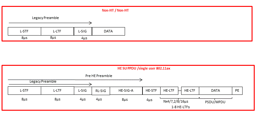 The frame format for 802.11a, called non-HT, and 802.11ax single user frame, called HE SU PPDU, is like this: