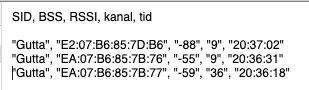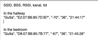 I asked him to do an Airport measure in his bedroom and send it via email. When I opened the mail I see a list consisting a lot of lines. In this blog article I have deleted all lines except one for each BSSID I see. This is an edited view.