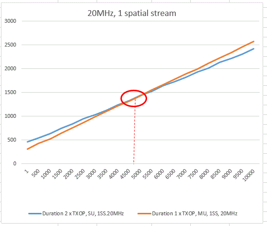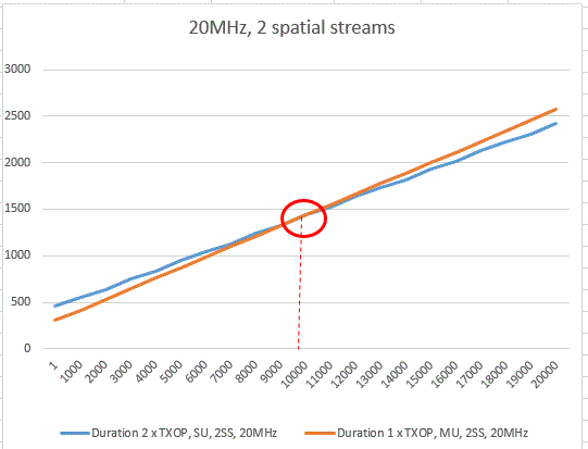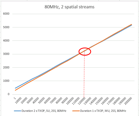 As we can see, the AP has to send rather big frame sizes before the duration for the MU TXOPs will go over the durations for the two SU TXOPs