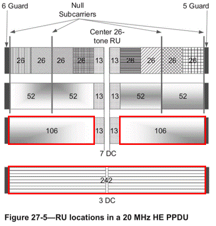 The use of subcarriers is different between SU and MU operations. On a 20MHz channel, the transmitter will use the full channel during single-user operations. This is 242 subcarriers, where 234 are used for data transfer and the remaining 8 are guard subcarriers.